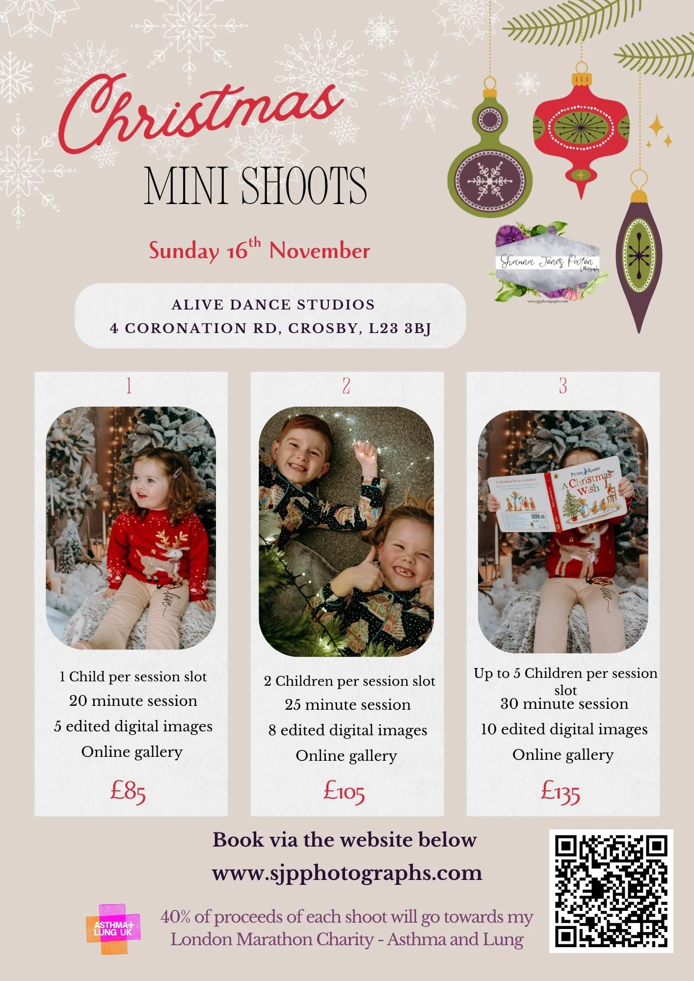 Thank you for considering a Christmas mini shoot, 40% of the proceeds from each session will go to my fundraising page.